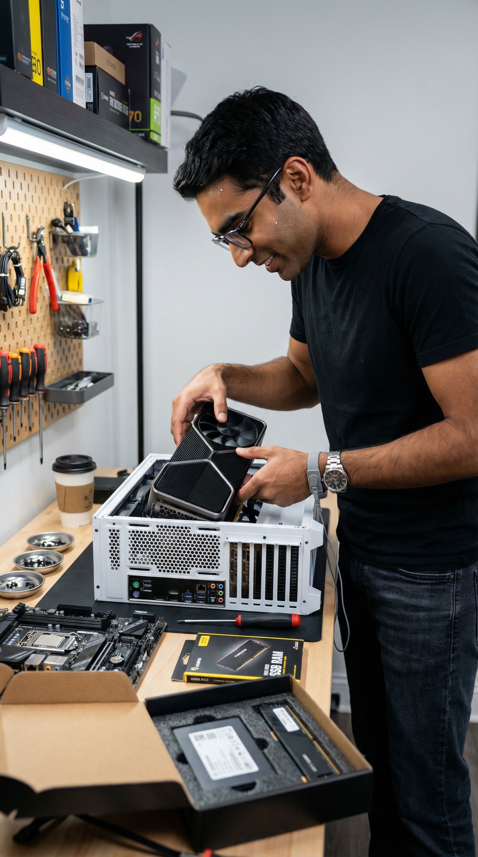 “new build. matte white case, gpu handled like a newborn. cable management may survive scrutiny. may.”