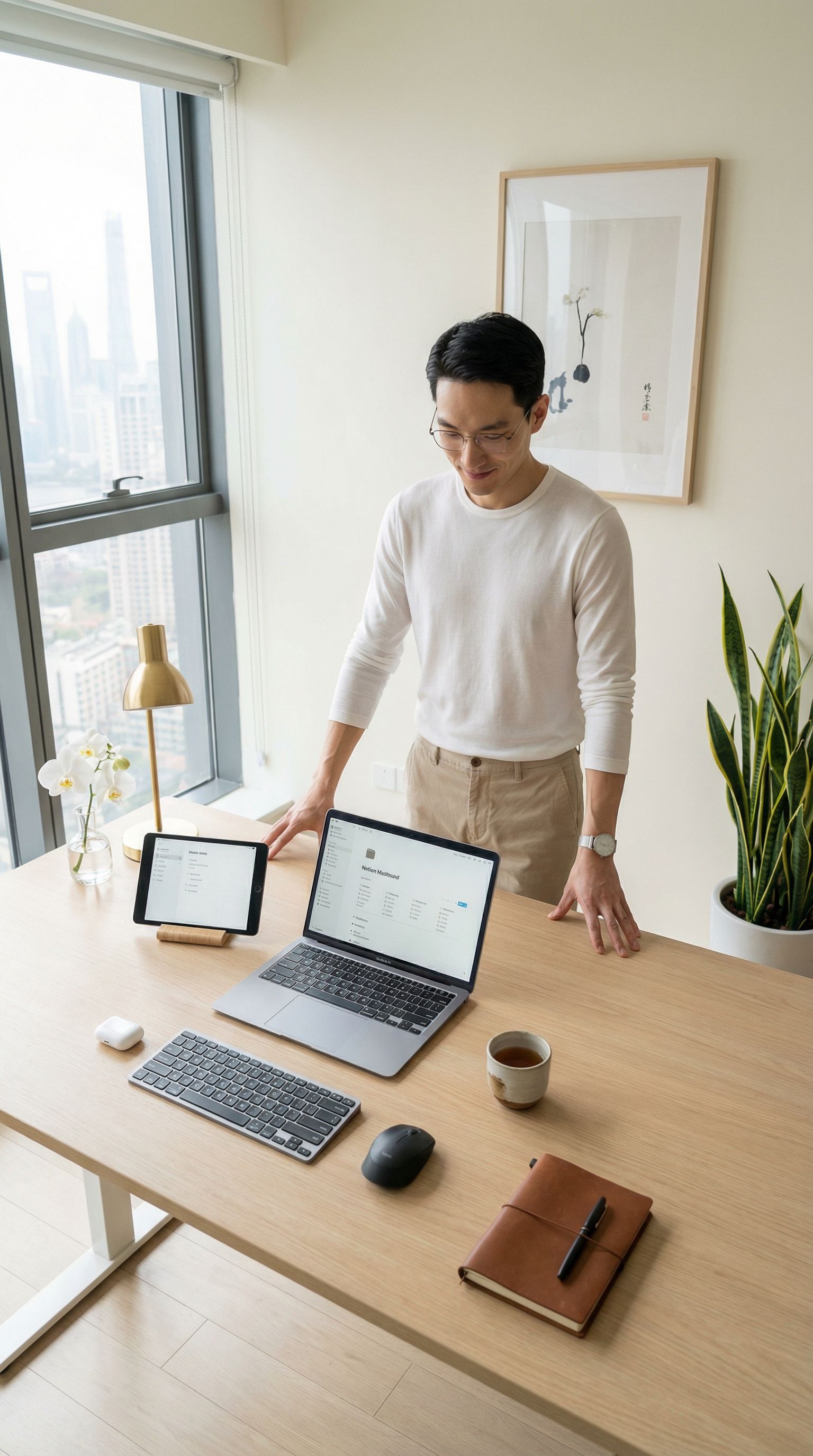 “the whole desk: macbook, ipad, notebook, plant. less surface, more focus.”