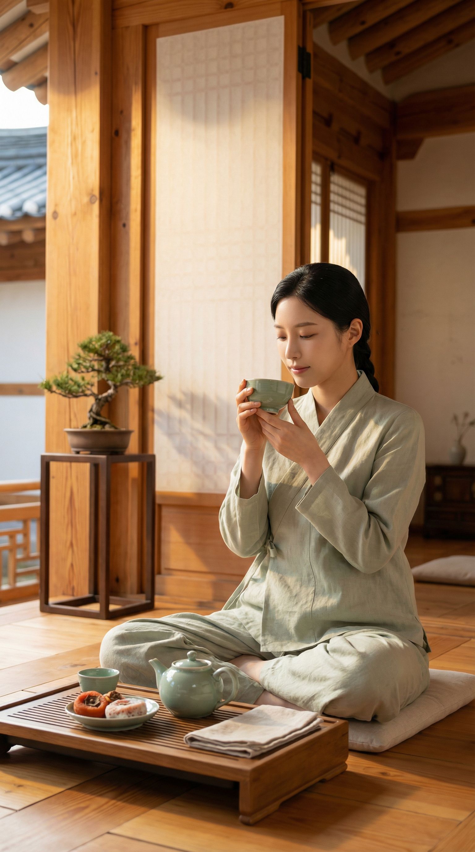 “green tea, ceramic cup, no clock. 오늘은 천천히.”