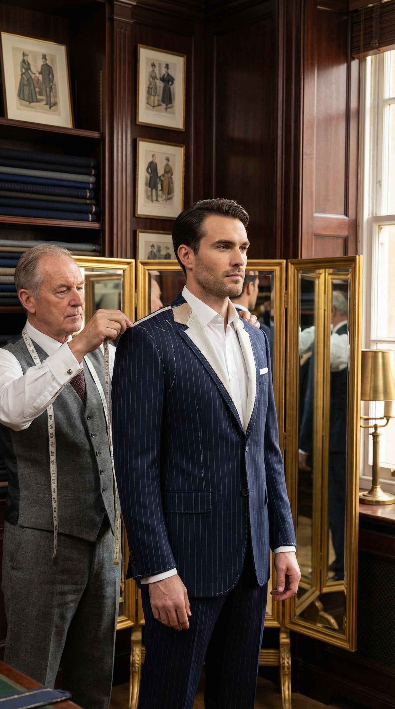“first fitting on the row. the chalk marks are the conversation. the suit listens before the tailor does.”