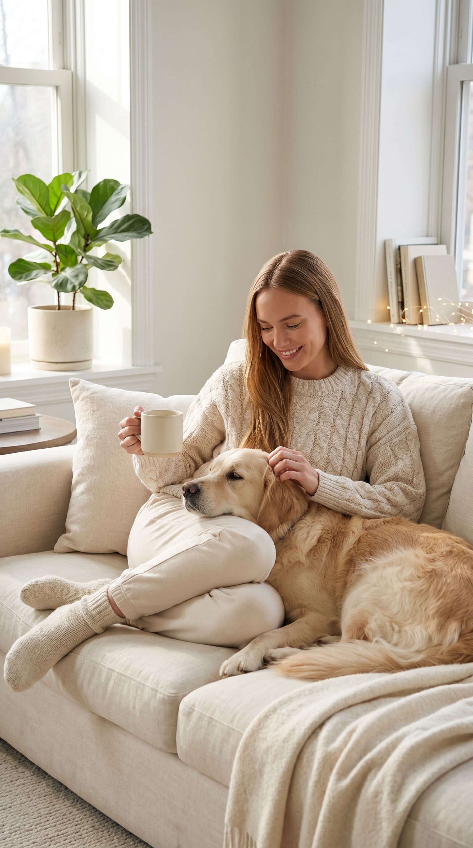 “couch, coffee, golden retriever. the to-do list can wait. he can't.”