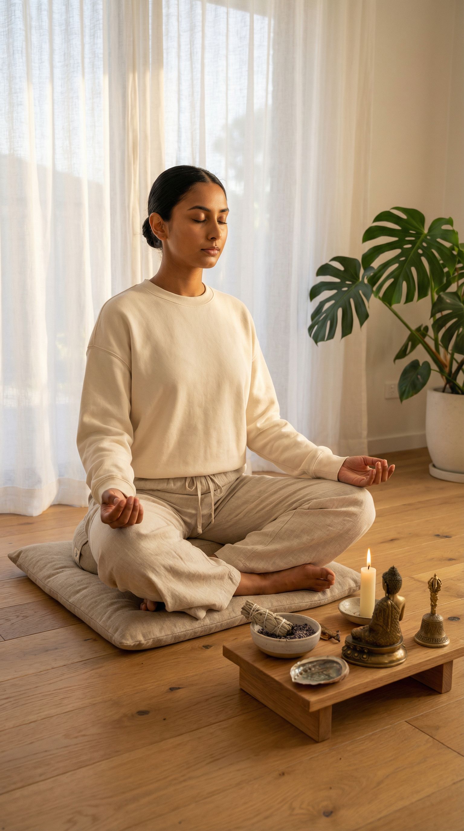 “before the phone. before the day. ten minutes that hold the rest of it. home altar, quiet floor, steady heart.”