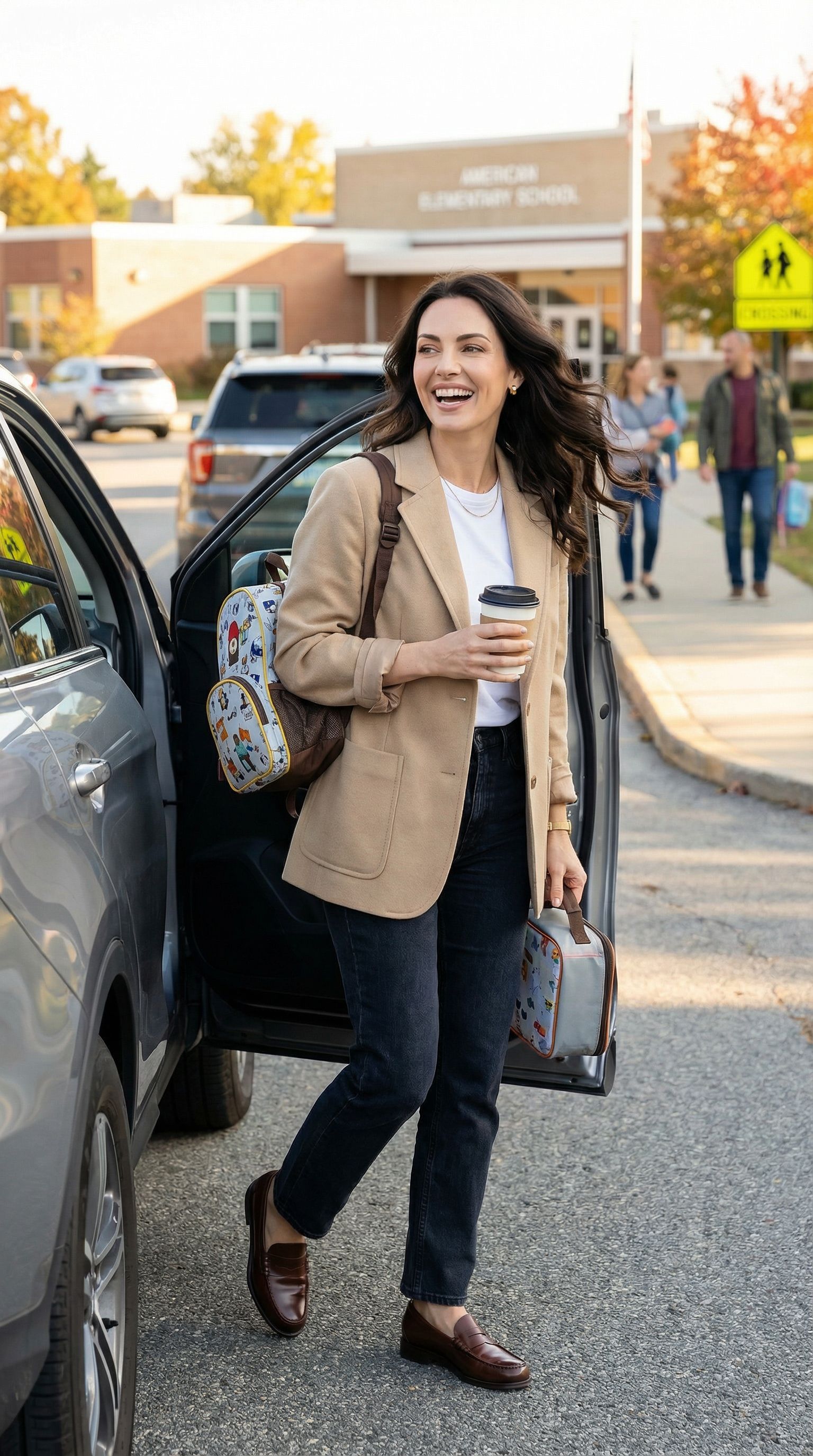 “drop-off fit: blazer, jeans, coffee, backpack, dignity (barely). she waved back. made my morning.”