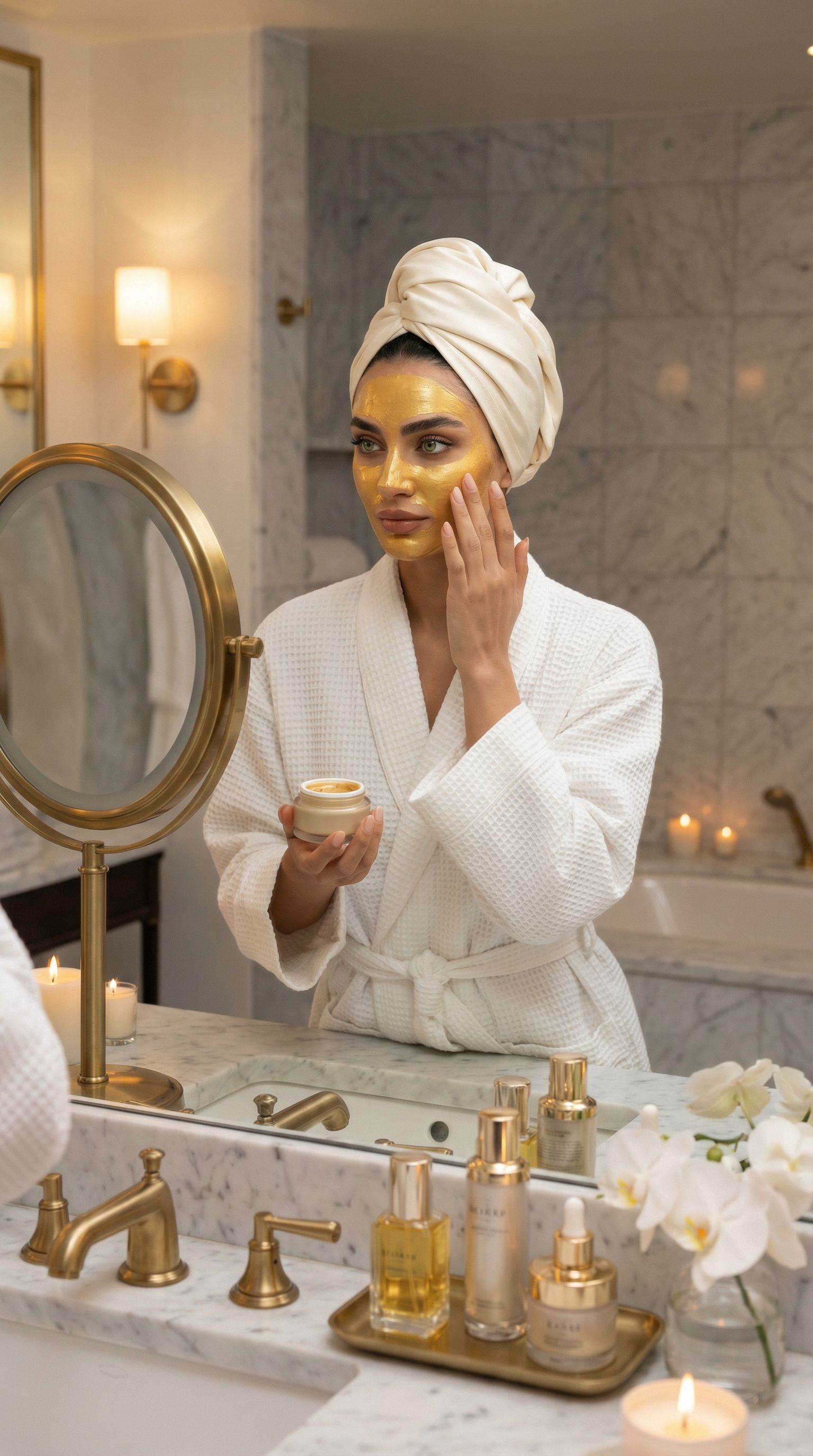 “gold mask, marble counter, zero meetings. some mondays are for the face.”