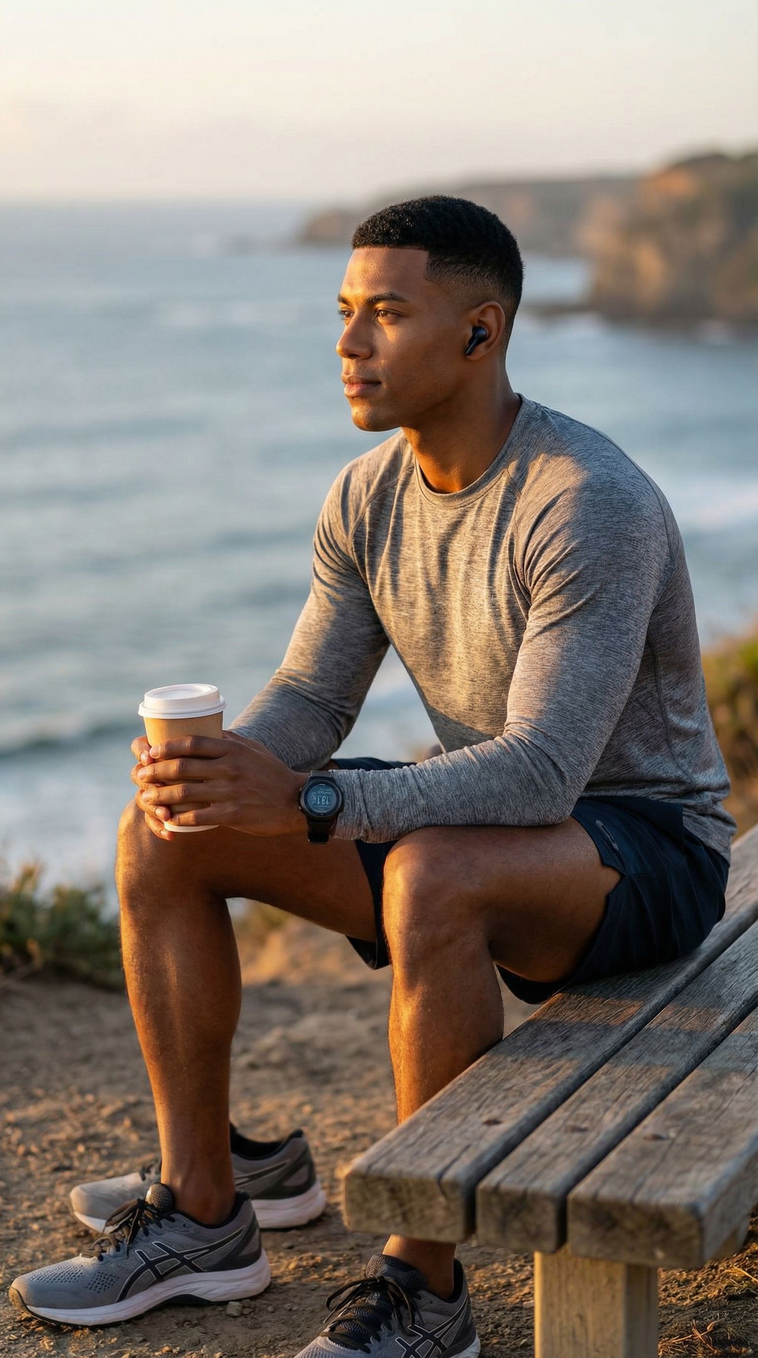 “post-run bench. one cappuccino. one earbud. the ocean doesn't need a podcast but i do.”
