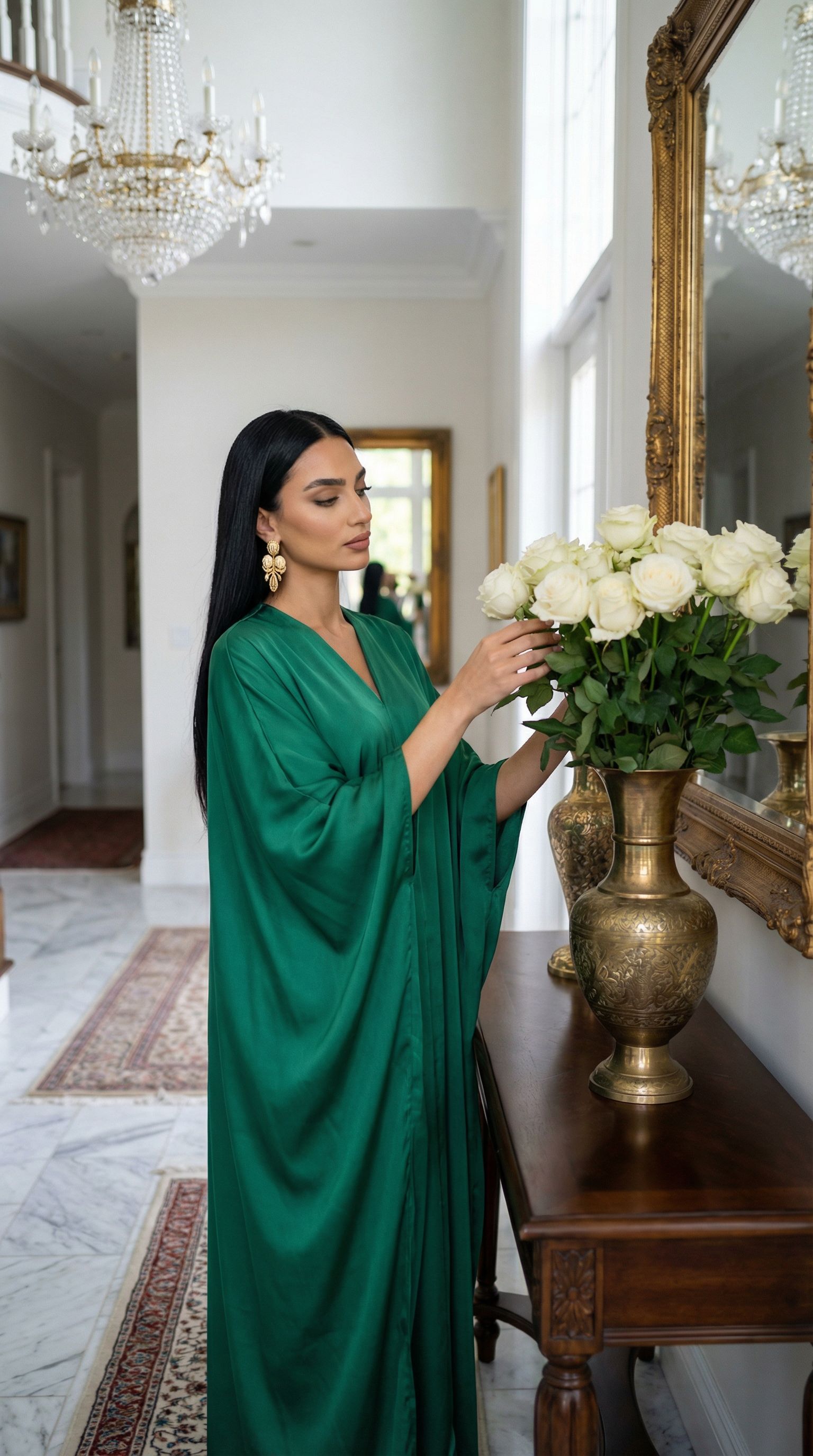“white roses in the brass vase. the entryway sets the tone for the house.”