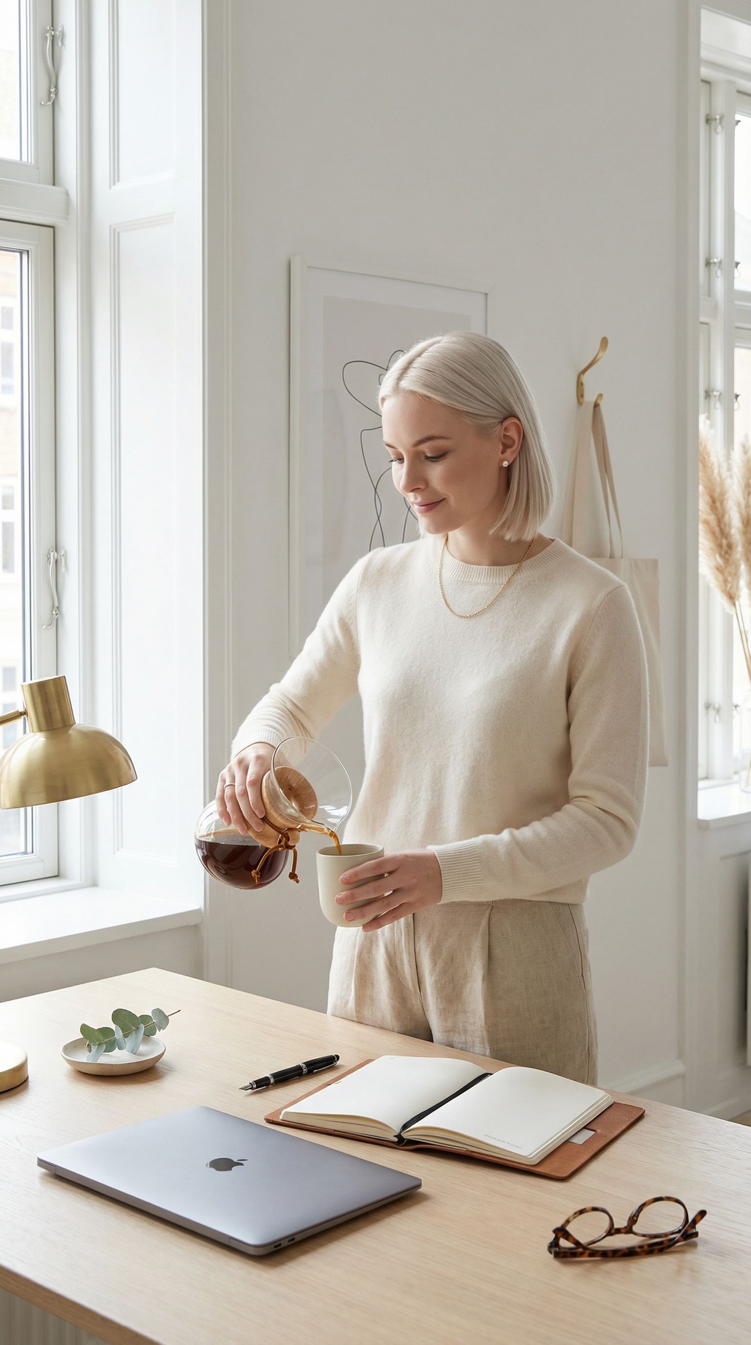 “morning coffee. desk cleared. the day starts when the mug is warm.”