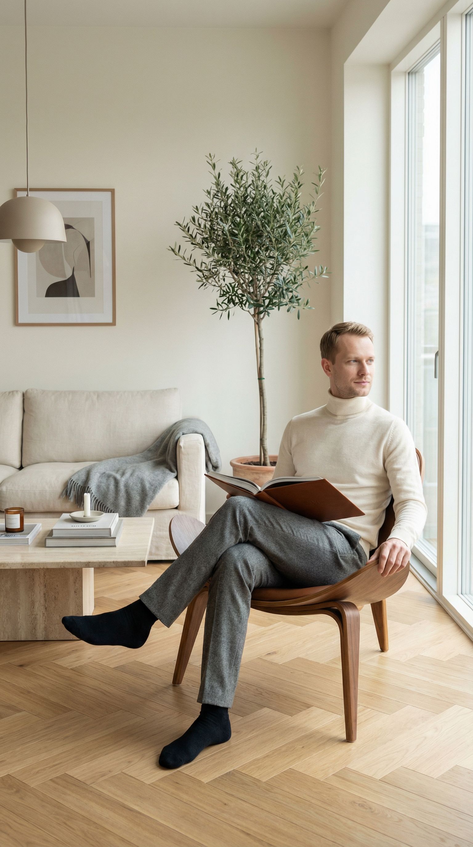 “wegner chair, design book, morning quiet. the room does the thinking.”