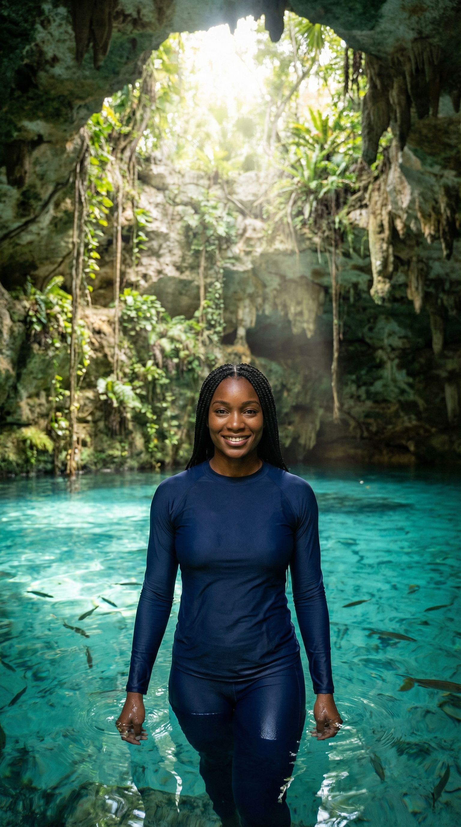 “cenote so clear you can see the bottom. i didn't want to leave and the fish didn't ask me to.”