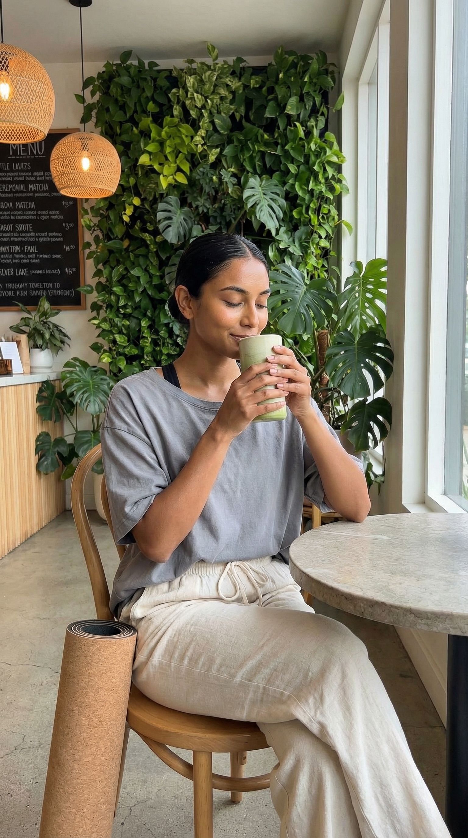 “class is over. the breath stays. matcha, quiet hands, a window full of green. this is the part i never skip.”