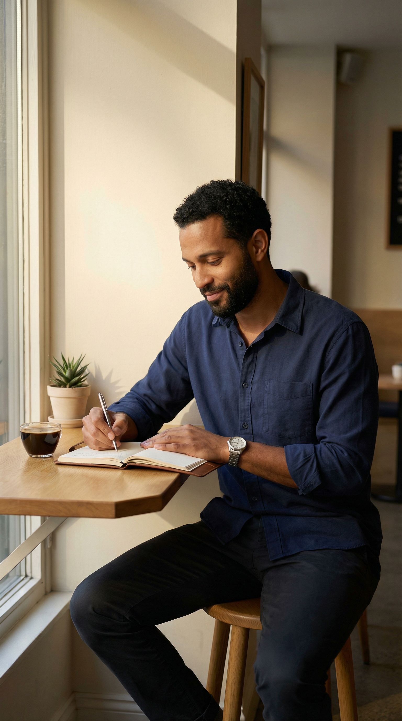 “quiet cafe, leather journal, one thought per page. the coffee went cold. the writing didn't.”