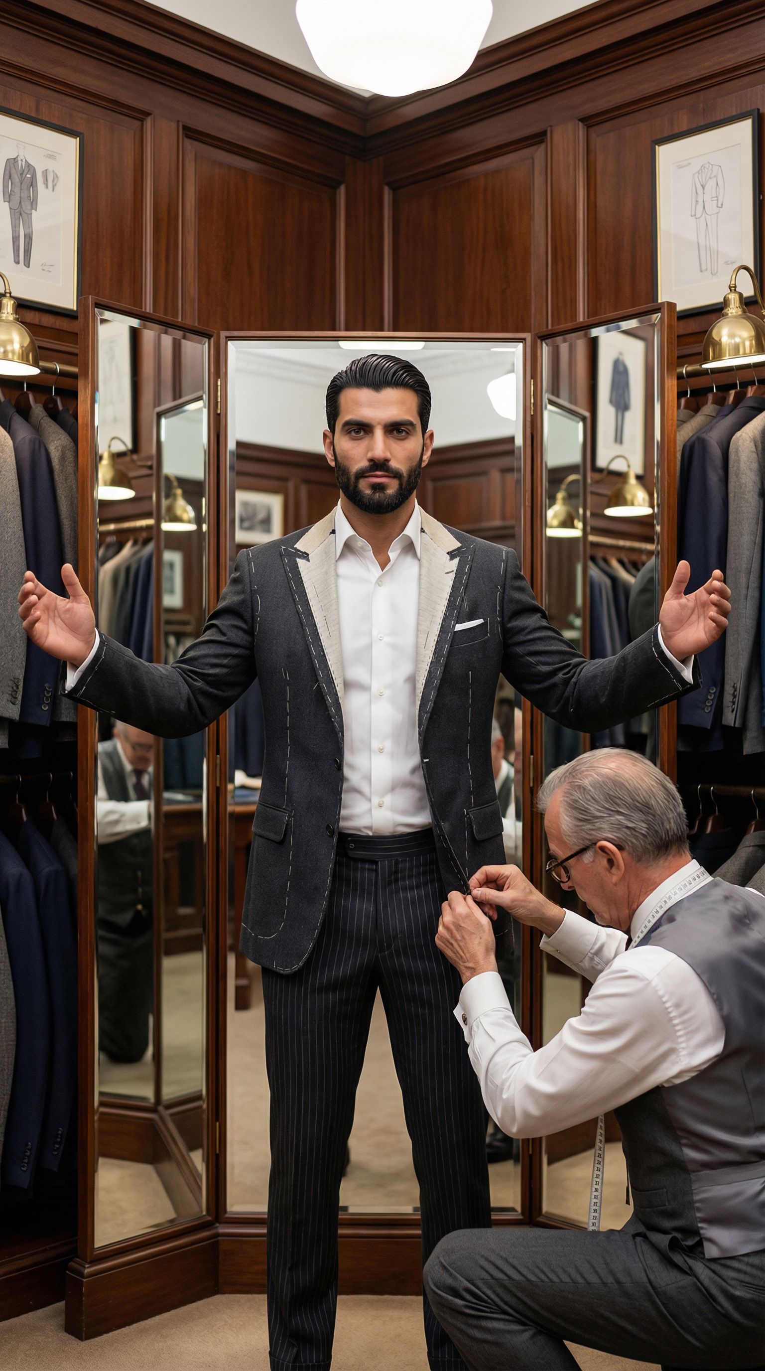 “first fitting. the shoulders are the only thing you can't fake. savile row takes its time. so do i.”