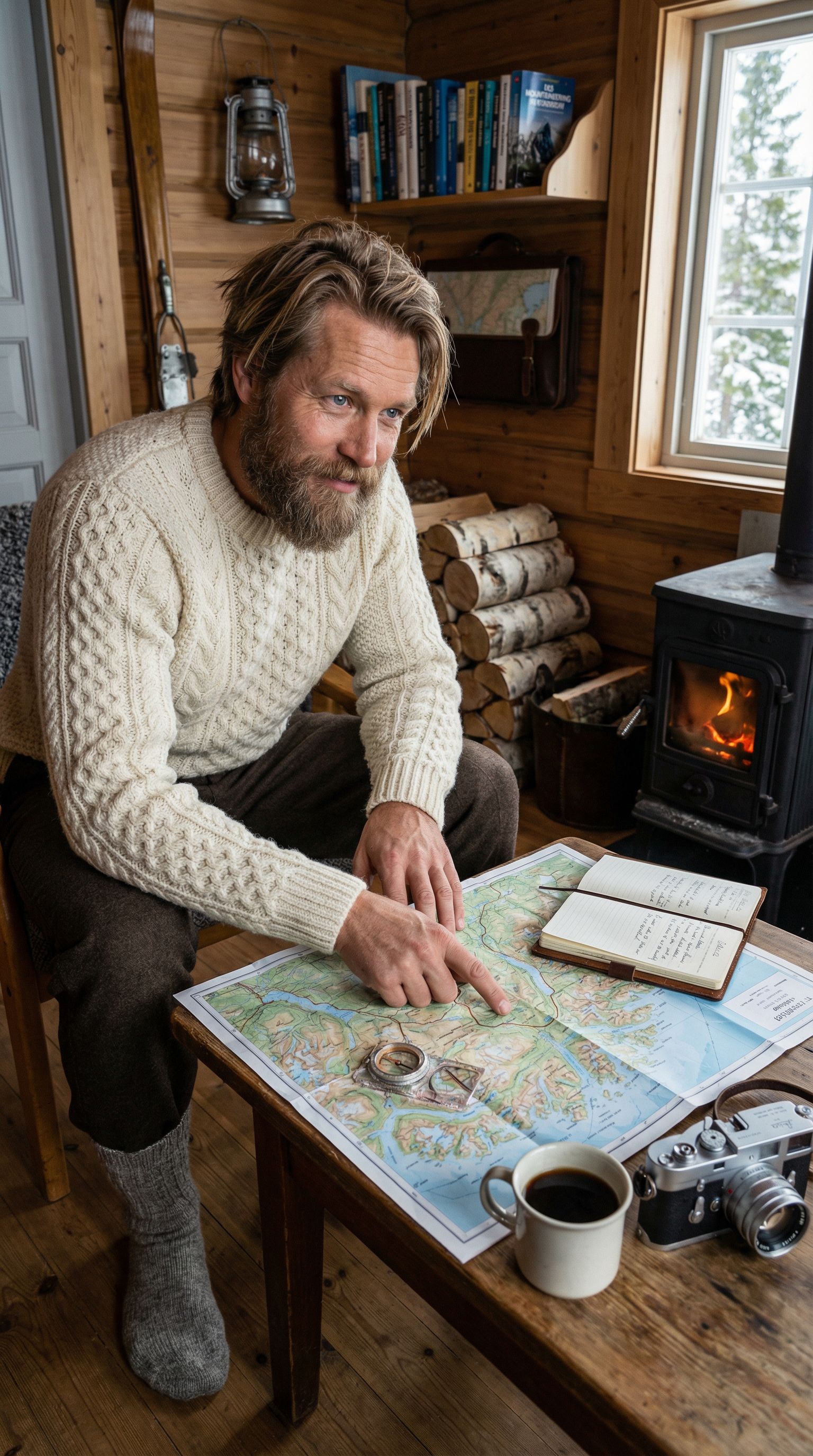 “hytte morning. map on the table, coffee in the mug. planning the route is half the trip.”