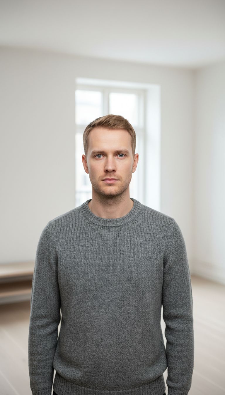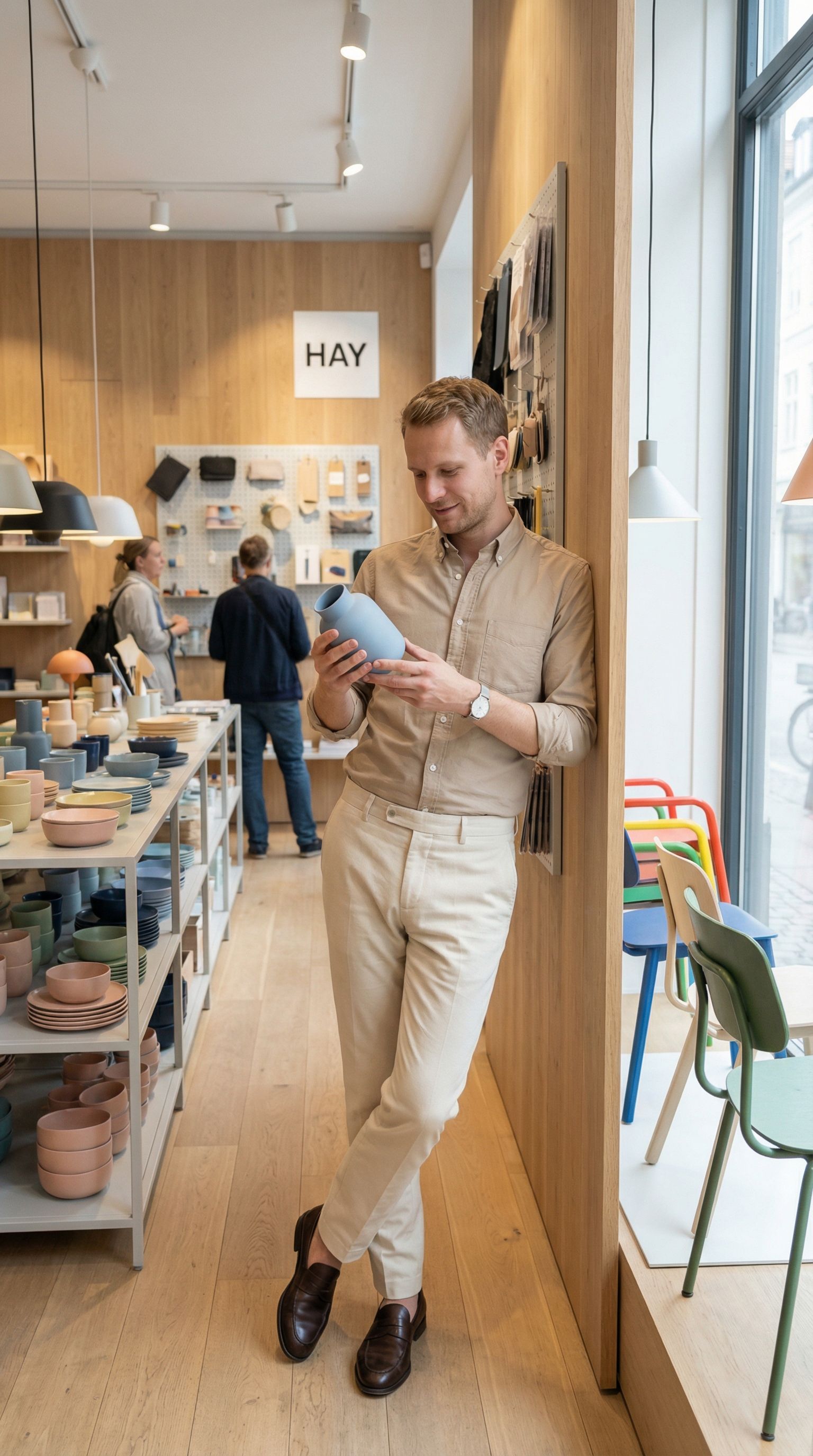 “hay store, ceramic vase in hand. considering whether it deserves the shelf. the shelf is honest.”