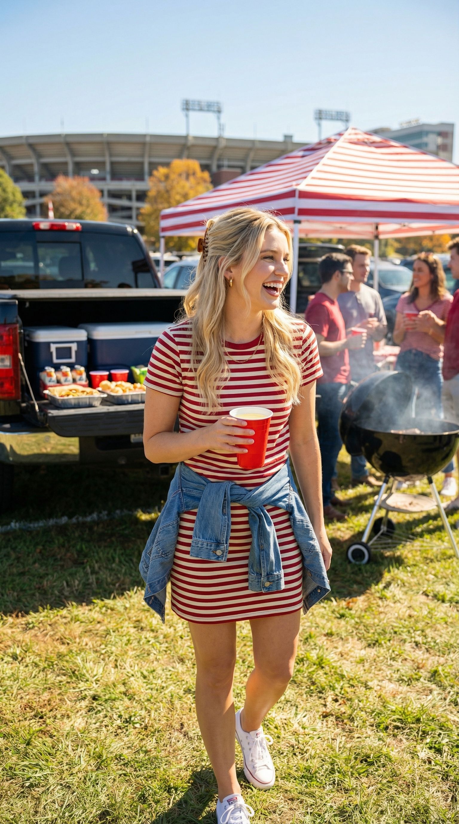 “tailgate look: striped dress $28, denim jacket from three years ago, sneakers my sister loaned me. go team whoever.”
