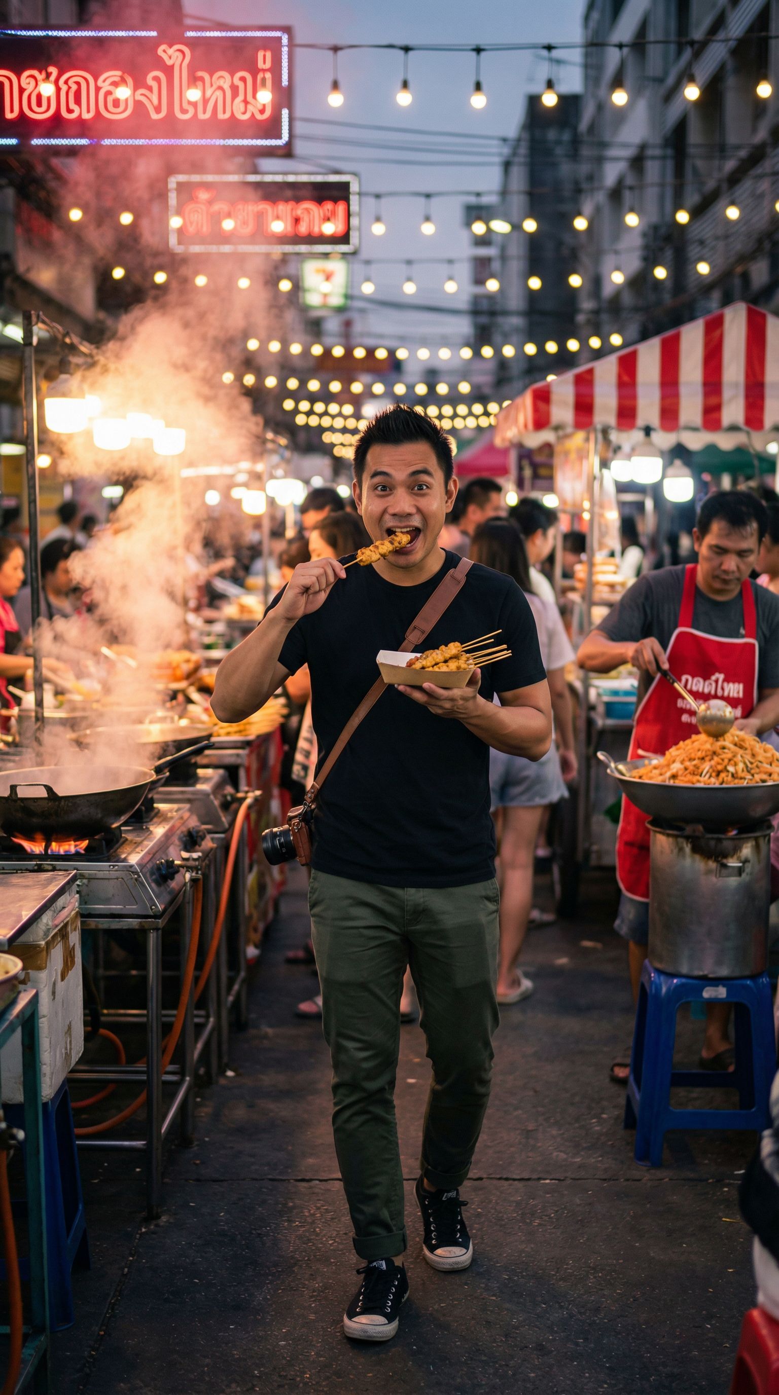 “bangkok night market, stall 7. auntie has been grilling satay for 42 years. i'm just a tourist with opinions.”