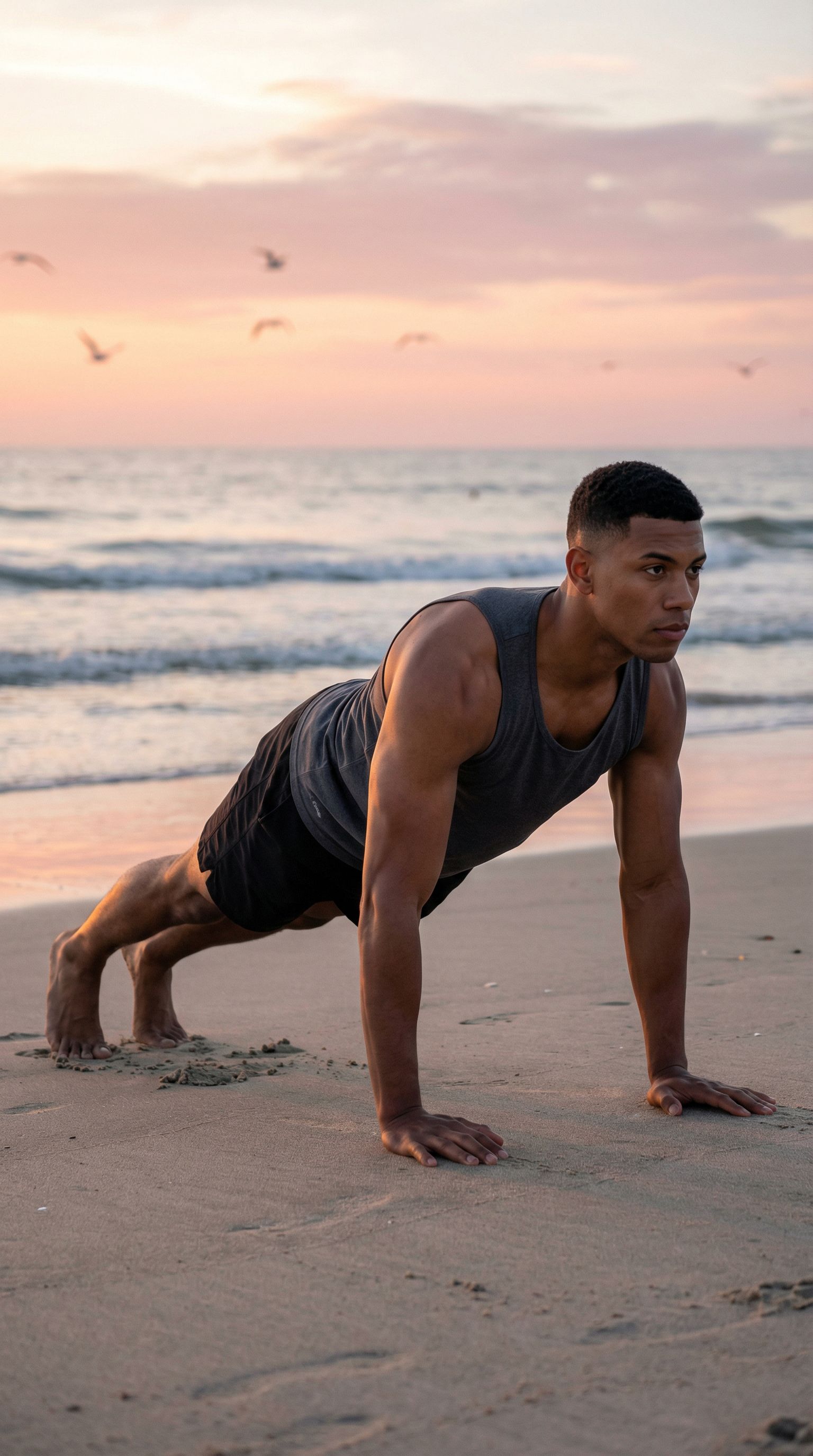 “dawn plank on the sand. the ocean doesn't care about my form. my shoulders do.”