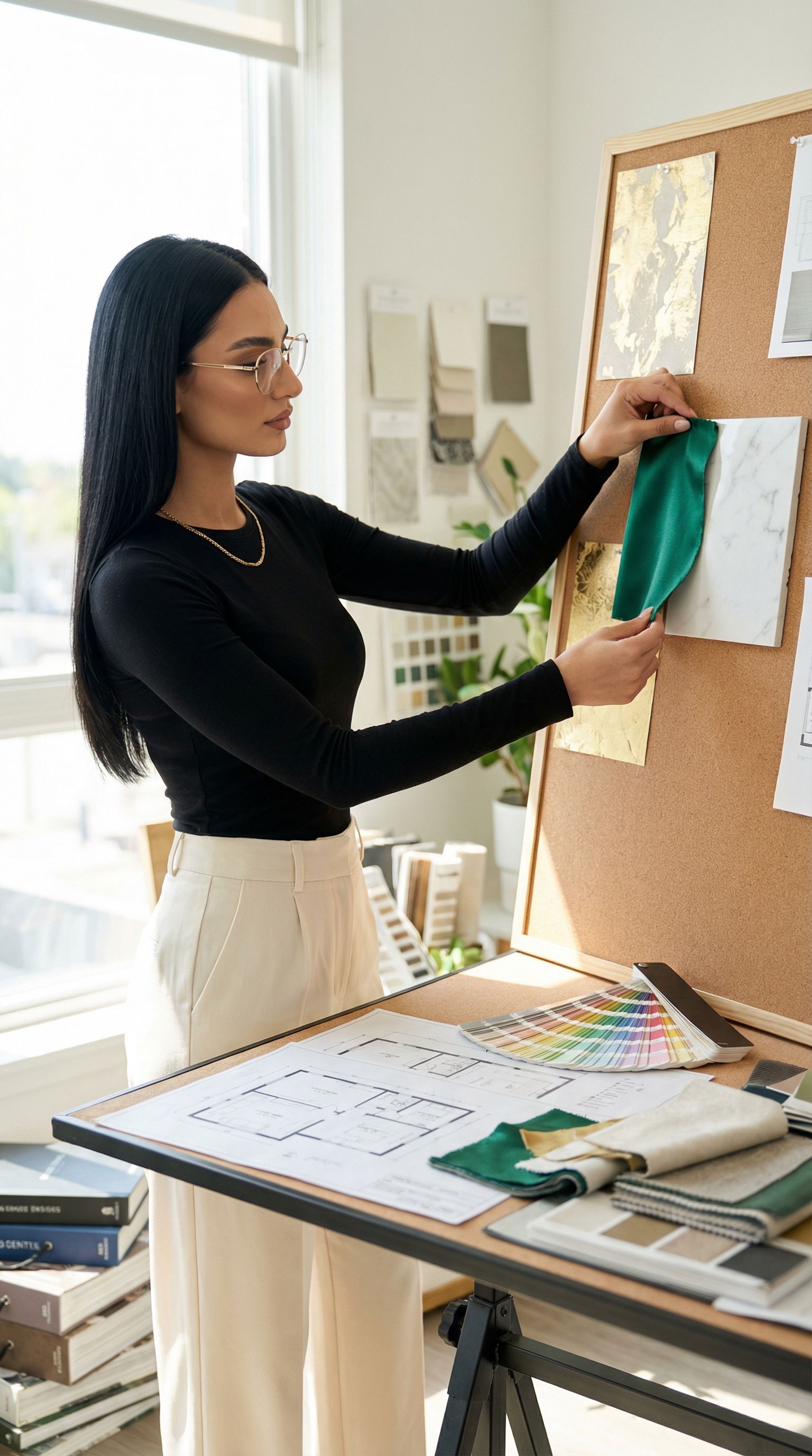 “emerald silk against marble. the mood board decides the room before the contractor does.”