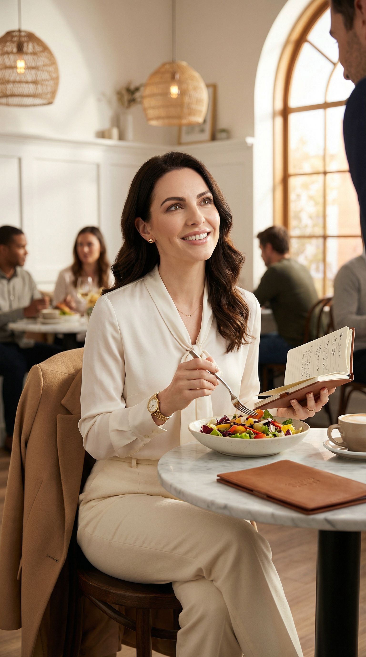 “client lunch. took notes on the napkin when i ran out of pages. the salad paid attention too.”